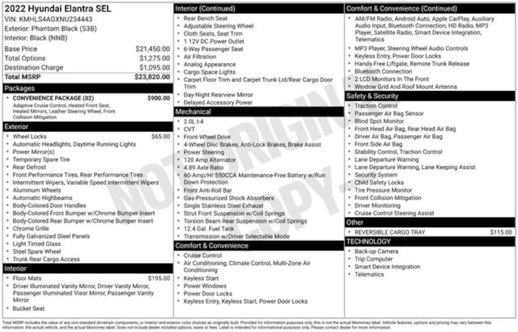Certified. 2022 Phantom Black 4D Sedan Hyundai Elantra SEL 2.0L 4-Cylinder DOHC 16V FWD Convenience Package, Electronic Parking Brake, Forward Collision Avoidance Assist, Full 10.25" LCD TFT Cluster, Heated Front Seats, Heated Outside Mirrors, Leather-Wrapped Steering Wheel, Option Group 02, Smart Cruise Control w/Stop & Go, Wireless Device Charging.
