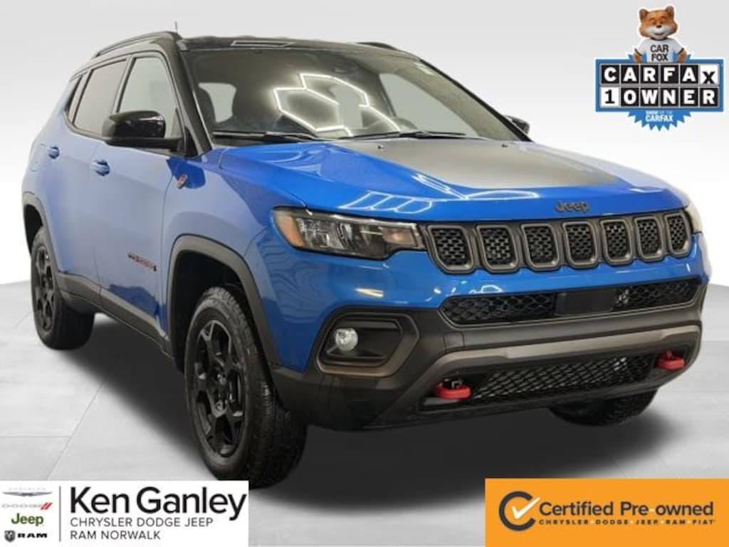 Certified. 2023 Laser Blue Pearlcoat 4D Sport Utility Jeep Compass Trailhawk 2.0L I4 DOHC 4WD 2nd Row USB Type A/C Charge Only, Heated Front Seats, Heated Steering Wheel, Power 2-Way Driver Lumbar Adjust, Power Adjust 8-Way Driver Seat, Quick Order Package 29E, Remote Start System, Reversible Carpet/Vinyl Cargo Mat, Trailhawk Convenience Group, Windshield Wiper De-Icer.