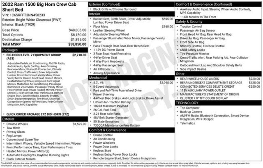 2022 Bright White Clearcoat 4D Crew Cab Ram 1500 Big Horn/Lone Star HEMI 5.7L V8 Multi Displacement VVT 4WD 115V Auxiliary Power Outlet, 115V Auxiliary Rear Power Outlet, 2nd Row In Floor Storage Bins, 400W Inverter, 4G LTE Wi-Fi Hot Spot, 8.4" Touchscreen Display, Air Conditioning ATC w/Dual Zone Control, Apple CarPlay, Auto-Dimming Exterior Driver Mirror, Auto-Dimming Rear-View Mirror, Big Horn Badge, Big Horn Level 2 Equipment Group, Black Exterior Mirrors, Black Premium Power Mirrors, Bluetooth Handsfree Phone & Audio, Class IV Receiver Hitch, Cluster 7.0" TFT Color Display, Connectivity - US/Canada, Convex Wide-Angle Mirror Insert, Exterior Mirrors Courtesy Lamps, Exterior Mirrors w/Heating Element, Exterior Mirrors w/Supplemental Signals, For Details, Visit DriveUconnect.com, Global Telematics Box Module (TBM), Glove Box Lamp, Google Android Auto, GPS Antenna Input, Heated Front Seats, Heated Steering Wheel, Integrated Center Stack Radio, Media Hub w/2 Charge Only USBs, ParkSense Front/Rear Park Assist w/Stop, Power 2-Way Driver Lumbar Adjust, Power 8-Way Driver Seat, Power Adjustable Pedals, Power-Folding Mirrors, Quick Order Package 27Z Big Horn, Radio: Uconnect 5 W w/8.4" Display, Rear Dome w/On/Off Switch Lamp, Rear Power Sliding Window, Rear Window Defroster, Remote Start System, Security Alarm, SiriusXM Radio Service, SiriusXM Satellite Radio, Sun Visors w/Illuminated Vanity Mirrors, Universal Garage Door Opener, USB Host Flip.