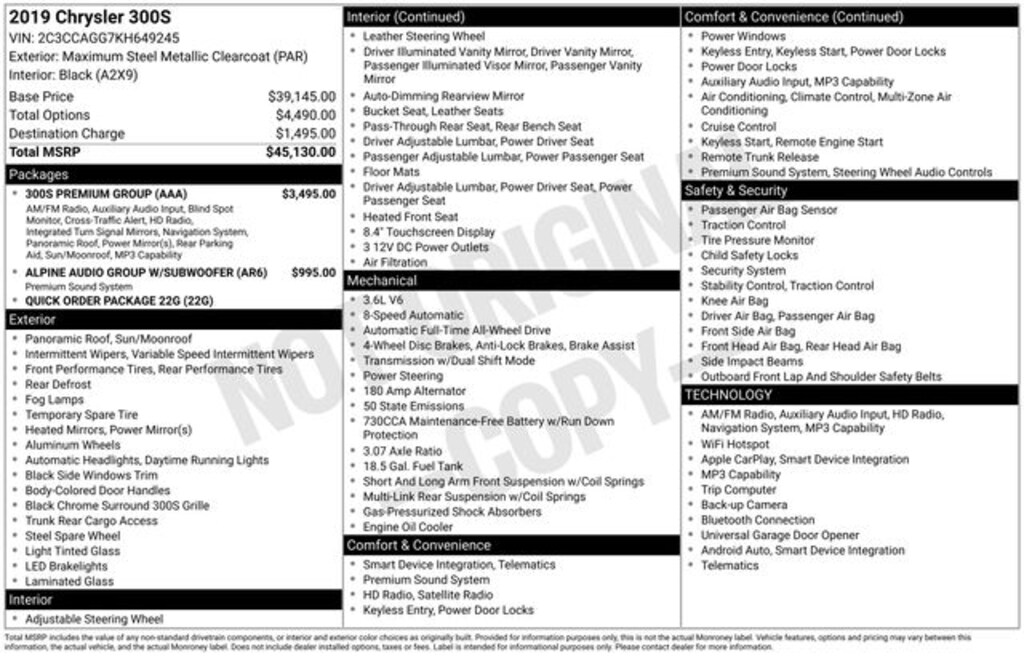 2019 Maximum Steel Metallic Clearcoat 4D Sedan Chrysler 300 S 3.6L V6 24V VVT AWD 1-Year SiriusXM Guardian Trial, 300S Premium Group, 4G LTE Wi-Fi Hot Spot, 5-Year SiriusXM Traffic Service, 5-Year SiriusXM Travel Link Service, 506 Watt Amplifier, 8.4" Touchscreen Display, 9 Premium Alpine Speakers, Alpine Audio Group w/Subwoofer, Apple CarPlay, Auto-Dimming Exterior Driver Mirror, Blind Spot & Cross Path Detection, Dual-Pane Panoramic Sunroof, Exterior Mirrors Courtesy Lamps, Exterior Mirrors w/Supplemental Signals, For Details Visit DriveUconnect.com, Google Android Auto, GPS Antenna Input, GPS Navigation, HD Radio, Integrated Voice Command w/Bluetooth, Media Hub (2 USB, AUX), ParkSense Front/Rear Park Assist System, Power Multi Function Mirror Manual Fold, Quick Order Package 22G, Radio: Uconnect 4C Nav w/8.4" Display, SiriusXM Satellite Radio, SiriusXM Traffic Plus, SiriusXM Travel Link, Surround Sound, Trunk Mounted Subwoofer, USB Host Flip.