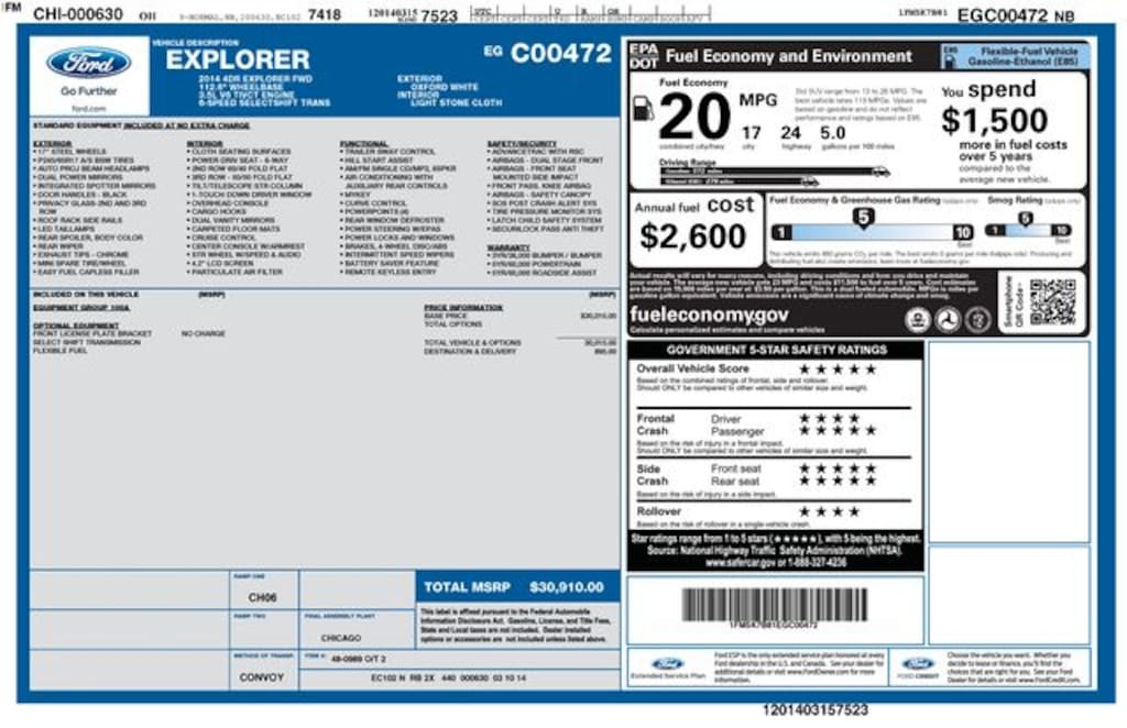 2014 4D Sport Utility Ford Explorer 3.5L 6-Cylinder SMPI DOHC FWD 4D Sport Utility, 3.5L 6-Cylinder SMPI DOHC, 6-Speed Automatic with Select-Shift, FWD, Cloth.