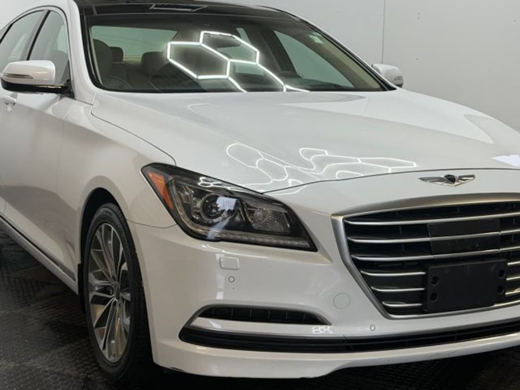 2015 Casablanca White 4D Sedan Hyundai Genesis 3.8 3.8L V6 DGI DOHC Dual CVVT AWD 7" TFT LCD Cluster Display, Auto-Dimming Outside Mirrors, Automatic Emergency Braking (AEB), Blind Spot Detection System, Dual Mode HVAC and CO2 Sensor, Electronic Parking Brake w/Automatic Vehicle Hold, Front & Rear Parking Assistance System, Full-Color Heads-Up Display, Genuine Aluminum Interior Accents, Genuine Matte Finish Wood Trim, Haptic Feedback Steering Wheel, HID Headlights w/Auto-Leveling, High Beam Assist, Integrated Memory System (IMS), Lane Departure Warning System (LDWS), Lane Keep Assist, Navigation System, Parking Guidelines, Power Heated & Cooled Front Bucket Seats, Power Heated/Cooled Front Bucket Seats, Power Rear Sunshade, Power Tilt-and-Slide Panoramic Sunroof, Power Tilt-and-Telescopic Steering Wheel, Power Trunk Lid, Pre-Safe® ty Seatbelt, Radio: AM/FM/HD/SiriusXM/CD/DVD/MP3 Audio System, Radio: AM/FM/SiriusXM/CD/HD/DVD/MP3 Audio System, Signature Package 02, Smart Cruise Control, Technology Package 03, Ultimate Package 04, Ultra-Premium Leather Seating Surfaces.