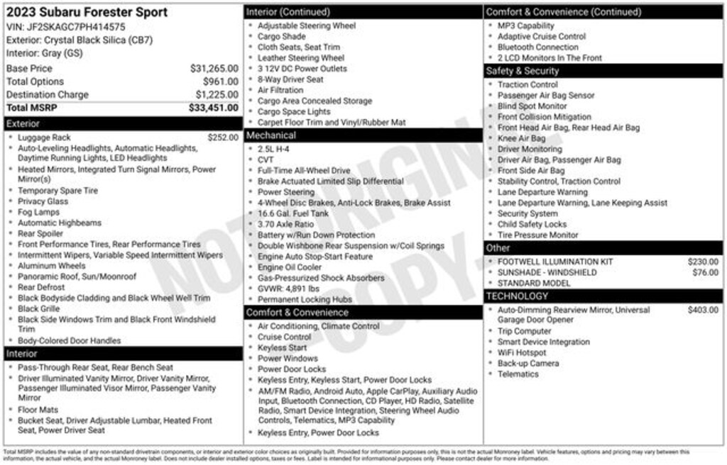 2023 Crystal Black Silica 4D Sport Utility Subaru Forester Sport 2.5L 4-Cylinder DOHC 16V AWD Standard Model.